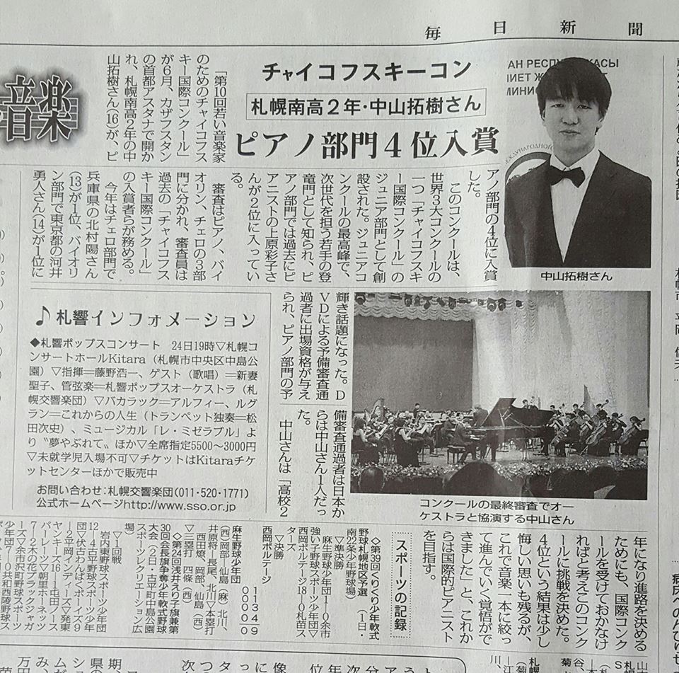 6月16日から25日までカザフスタンのアスタナで開催されておりました「第10回若い音楽家のためのチャイコフスキー国際コンクール」で札幌コンセルヴァトワールの中山拓樹さんが第4位に入賞しました。このコンクールはかつて現在活躍中のピアニストのラン・ランや上原彩子さんを輩出したことでも知られ、ジュニアコンクールの最高峰とも言われています。ピアノ部門での日本人の入賞は第2回に第2位受賞の上原彩子さん、第5回に第3位入賞の沼沢淑音さんに続き3人目の快挙となります。第10回若い音楽家の為のチャイコフスキー国際コンクールの公式サイトはこちら。