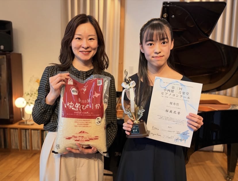 最優秀賞を受賞した根本さんには副賞として東川町特産のお米10キロ、温泉ペア券、小西健二音楽堂でのリサイタル権が授与されました。また、桜庭花音さんにもお米5キロ、温泉券、ジョイントリサイタル権が授与されました。